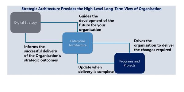 Strategic Architecture is Strategic Architects tailored approach they do in engagements. It includes taking a high-level enterprise architecture view of a strategic digital opportunity that aligns with the organisation's strategic vision and can lead to transformation to better business outcomes.